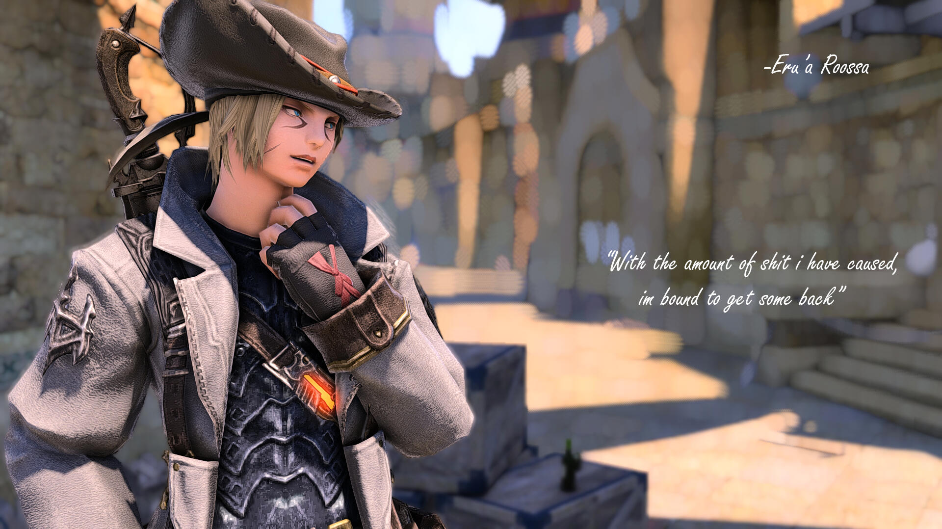 Born in Central Shroud Eru grew up with his older brother and Twin sister, his Mother was a lone mother as his father had left before he was born, his brother knew Eru father slightly but whatever he knew of him was nothing good. Eru helped his Mother with Farm work whenever he could along with his brother and Twin sister.by the time Eru had turned 17 years of age his mother had gotten a bad unkown deadly disease. Eru had trouble watching his Mother work herself to the bone just to make a living for them that he decided to leave home for a bit telling his Mother that he promised to find Medecine for her.His mother protested against him turning it into a bad argument between the two. Her not wanting her son to leave and him wanting to leave so that he could find medication for her. this Later creates a fractionin his relationship between Eru and his Older brother and Twin sister in their lives.While on his travels Eru meets and indevidual named Traiko Avojka. a Horthar Gunbreaker who is a Mercenary for Hire. Eru Tells him about his situation and long story short Traiko takes him under his wing and teaches him the ways of becoming a gunbreaker and a gun for Hire to earn some gil.They take on some Jobs togheter and work up the chain of hired Killers. this also earns him a reputation and get the nickname the traveling wanderer. on the last Job Eru does with Traiko they fight a dragon outside Ishgard. The job ends up as a bust as Traiko Dies sacreficing himself to protect Eru. The Dragon manges to Escape and Eru ends up with no Gil in the end from the Job. However Eru does take Traikos hat and swears he will get revange on the dragon that cost him his Mentor Traiko his lifeThis incident makes Eru create a predejuice against Dragons aswel. Later on returning Home to his family hoping his Mother is as well as she can be, turns out that she has passed away while he was on his travels. Eru older Brother and Twin sister start arguing with him about his dissaparence while their Mother was sick. the argument ultimatley concludes makeing their relationship fractured. Before buring his mother Eru grabs the homade piece of jewellry that his Mother also wore around her wrist and tied it to his Hat so that he would have a piece of her for wherever in life he was.Later on while trying to take care of whats left of their Home a gang appers called The Crystal Takers. turns out Eru'a older Brother had taken a loan from them and now they were here to collect payment.Eru manages to escape bringing his older brother and Twin sister and His Twin Sisters son with him. tho this event ultimatley causes the destruction of his home. now on the road Eru and his Brother and sister and his Sisters Child has to survive on the road. while on the road they encounter multible people that later become their friends suffering from diffrent harsh harsh pasts just like them.Now with a group of around 10 people Eru is striving to create a better future for both his new friends and remaining family.